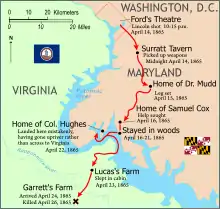 La jumătate de oră după ce a fugit de la Teatrul lui Ford, Booth a traversat podul Navy Yard înn Maryland.[13]:67–8 O santinelă a Armatei l-a întrebat unde călătorește așa târziu; Booth a spus că pleacă acasă în orașul Charles din apropiere. Deși civililor li se interzisese să treacă podul după ora 9 pm, santinela l-a lăsat să treacă.[91] David Herold(d) a trecut peste același pod mai puțin de o oră mai târziu[13]:81-2 și s-a întâlnit cu Booth. [13]:87 După ce au recuperat armele și proviziile depozitate anterior la Surattsville(d), Herold și Booth au călătorit la casa lui Samuel A. Mudd(d), un medic local, care i-a pus o atelă la piciorul[13]:131,153 pe care Booth și-l scrântise sărind din lojă și mai târziu i-a făcut o pereche de cârje.[13]:131,153