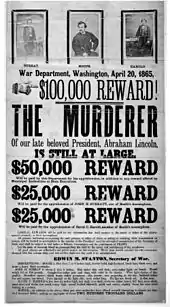 Vânătoarea conspiratorilor a devenit rapid cea mai mare din istoria SUA, implicând mii de soldați federali și nenumărați civili. Edwin M. Stanton(d) a condus personal operațiunea,[92] autorizând recompense de 50.000 dolari (echivalent cu cca 800.000 de dolari in prezent) pentru Booth și 25.000 de dolari fiecare pentru Herold și John Surratt.[93]