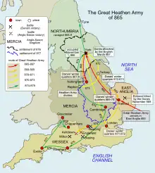 În anul 873 d.Hr., războaiele și aglomerația îl fac pe Eivor și clanul acestuia să părăsească Norvegia.[11][22] Ei se stabilesc în Anglia medievală ca parte a expansiunii vikinge în Europa. Acest lucru îi aduce în conflict cu regatele anglo-saxone ale Wessex-ului, Northumbriei, Angliei de Est și Merciei.[23] Clanul lui Eivor va da piept cu forțele conduse de liderii acestora, inclusiv cu cele ale lui Alfred cel Mare, conducătorul regatului Wessex.[19][24] În acest timp, Eivor îi întâlnește pe Cei Ascunși și se alătură luptei acestora contra Ordinului Anticilor.[11] Orașele explorabile sunt Winchester, Londra și York.[25][lower-alpha 2] Părți din Norvegia sunt și ele incluse aici.[11]