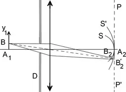 La o lentilă subțire, puternic difragmată, numai punctul A1 situat pe axa optică a obiectului y1 dă o imagine aproximativ punctiformă A2 (în aproximația Gauss). Un punct oarecare B1, îndepărtat față de axă, trimițând pe lentilă fascicule înguste, înclinate, formează două focale, perpendiculare între ele, în B2 și B'2. În locul unei imagini clare a obiectului y1, în planul PP' (care este planul imaginii în aproximația Gauss) lumina se va concentra după două suprafețe caustice S și S' - locul geometric al celor două focale.
