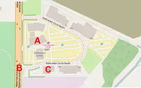 ![]() A – Locul împușcăturilor B – Locul în care unele persoane au fost tratate C – Școala pentru orbi în care unele persoane s-au adăpostit | |||