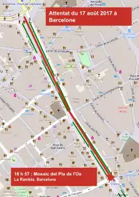 Pe 17 august, în jurul orei locale 16:56, un Fiat Talento alb a intrat pe trotuarul străzii La Rambla din centrul Barcelonei. Furgoneta a mers în zigzag circa 530 de metri, lovind pietonii care circulau între Plaça de Catalunya și Gran Teatre del Liceu.[10] Strada este una dintre cele mai cunoscute și mai populare zone ale orașului, fiind vizitată de turiști și localnici deopotrivă. Pietonii s-au adăpostit în hotelurile, restaurantele și bisericile din zonă după informația conform căreia mai mulți oameni au fost luați ostatici în restaurantul Luna de Istanbul.[11] Informația a fost între timp infirmată de autorități.[12] Șoferul a reușit să scape înaintea sosirii forțelor de ordine.[13] Incidentul a provocat panică, iar poliția a intervenit la fața locului și a instituit o zonă de securitate.[11]