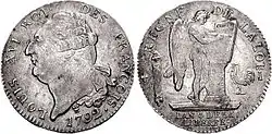 Prima sa contribuție este Ludovicul de aur de 24 de livre, tipul cu geniu; aversul poartă încă efigia regelui Ludovic al XVI-lea, cu titulatura ROI DES FRANÇOIS, în ortografia actuală: Roi des Français[16], și milesimul 1792. Reversul monedei reprezintă un Geniu înaripat care scrie cuvântul Loi[17], pe o stelă cu deviza LE RÈGNE DE LA LOI[18] și mențiunea AN III DE LA LIBERTÉ[19][20]. Un écu de șase livre și o jumătate de écu de argint au reluat acest motiv.