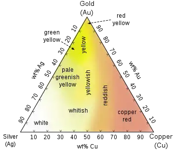- Aliaje realizate cu argint și cupru în variate proporții, producând aurul alb, galben, verde și roșu. Acestea sunt de obicei aliaje maleabile.