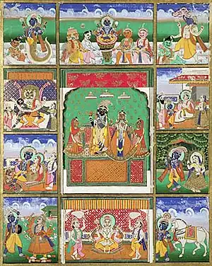Cei zece avatari ai lui Vishnu: (în sens orar, din stânga-sus) Matsya, Kurma, Varaha, Narasimha, Vamana, Parshurama, Rama, Krishna, Buddha și Kalki. În centru, Krishna