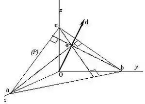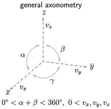 Se pornește de la un plan oarecare, planul axonometric (P), care întretaie axele de coordonate în trei puncte, care formează triunghiul axonometric. Fie segmentul normal pe planul axonometric (P). Se notează unghiurile: și respectiv . Proiecțiile ortogonale ale segmentelor și respectiv pe planul axonometric sunt segmentele și respectiv . Direcțiile acestor segmente sunt direcțiile axelor axonometrice din proiecție, iar dimensiunile lor sunt și respectiv .[1]