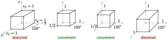 | 60° cabinet | 153.4° | 116.6° | arcctg(vx) | ||||||