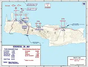 Pe 25 aprilie 1941, regele George al II-lea și guvernul lui au părăsit Grecia continentală pentru a se refugia în insula Creta. Creta a fost atacată de germani pe 20 mai 1941.[111] Aceștia au declanșat cea mai mare invazie a trupelor aeropurtate de până atunci, atacând trei aeroporturi principale de la Maleme, Rethymno și Heraklion. După șapte zile de lupte grele, comandanții aliați au ajuns la concluzia că apărarea nu mai poate rezista și au ordonat evacuarea trupelor de sub comanda lor din regiunea Sfakia. Până pe 1 iunie, Aliații retrăseseră toate trupele din Creta, iar germanii desăvârșiseră ocuparea insulei. Din cauza pierderilor grele suferite de trupele de elită de parașutiști, Hitler a interzis din acel moment executarea oricărei operațiuni aeropurtate de anvergură.[112] Generalul Kurt Student avea să spună despre Creta că a fost mormântul parașutiștilor germani și o victorie dezastruoasă.[112] Regele George al II-lea și guvernul lui au fost evacuați din Creta în Egipt în noaptea de 24-25 mai.[39]