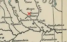 ![]() Lombardy in 1522. The location of the battle is marked. | |||||||