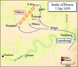 Astfel, neobservat, Luxembourg a învăluit flancurile lui Waldeck. Dacă Waldeck ar fi observat la timp că comandantul francez își împărțise armata, ar fi putut ataca stânga franceză izolată înainte ca dreapta să își ocupe pozițiile, dar nu a făcut-o.[8] După ce flancul drept (condus de Luxembourg) și-a ocupat pozițiile, aproximativ la ora 10 deschide focul asupra infanteriei inamicului, lovind cu eficacitate. Aripa stângă franceză condusă de locotenent-generalul Jean Cristophe, conte de Gournay, începe atacul cu un asalt al cavaleriei, dar uciderea lui Gournay provoacă dezordine în rândurile cavaleriei, iar aceasta se retrage la Fleurus pentru a se regrupa.[9] Totuși un alt asalt al cavaleriei flancului drept are mai mult succes, împingând în spate cavaleria aliaților. Imediat după aceea cavaleria și infanteria franceză avansează pe ambele flancuri ale liniei lui Waldeck, care văzându-se încercuită, se frânge. Unele trupe aliate reușesc să se regrupeze lângă Fleurus, dar sunt copleșite. În ciuda faptului că era presat de cavaleria franceză, Waldeck organizează o nouă linie de rezistență cu forțele rămase, dar și aceasta se prăbușește sub impactul infanteriei franceze, euforică după succesul inițial. Ceea ce rămâne din trupele lui Waldeck se îndreaptă spre Nivelles.[10]
