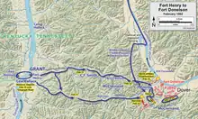 În zilele de 4 și 5 februarie, Grant a debarcat două divizii imediat la nord de Fort Henry pe Râul Tennessee. (Deși nu era numită încă așa, trupele sub comanda lui Grant au constituit nucleul Armatei Tennessee, care a repurtat mai multe succese.[2]) Planul său era de a avansa până la fort în ziua de 6 februarie în timp ce era atacată simultan de vasele înarmate comandate de Andrew Hull Foote. O combinație între eficiența tirului tunurilor navale și slaba aranjare din fort, aproape complet inundat de apele râului, l-a determinat pe comandantul acestuia generalul Lloyd Tilghman, să se predea lui Foote înainte de sosirea armatei.