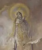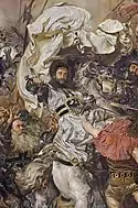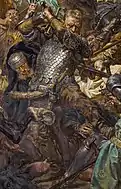 - Zyndram din Maszkowice, un alt cavaler polonez, ținând o sabie deasupra capului lui von Jungingen;[3][8]