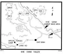 Satul Khe Sanh era reședința districtului Huong Hoa, o zonă populată cu sate ale degarilor și plină de plantații de cafea, aflată la aproximativ zece kilometri de frontiera cu Laos pe drumul național 9 din Vietnam, cel mai nordic drum transversal din Vietnamul de Sud. Acest drum grav deteriorat ducea din zona de coastă prin zona muntoasă din vest și apoi trecea granița în Laos. Baza de luptă și-a avut originea în construcția unui aerodrom de către Forțele Speciale ale Armatei SUA în august 1962 lângă sat la un vechi fort francez.[8] Tabăra a devenit apoi un avanpost al programului Civil Irregular Defense Groups (CIDG) al Forțelor Speciale, al cărui scop era cel de a observa infiltrarea Armatei Populare Vietnameze de-a lungul graniței și de a proteja populația locală.[9] În noiembrie 1964, Beretele Verzi și-au mutat tabăra pe Platoul Xom Cham, viitoarea poziție a Bazei Khe Sanh.