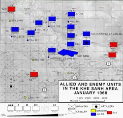 Datorită sosirii Diviziei 304, baza Khe Sanh a primit întăriri de la Batalionul 1 din Regimentul 9 Marină la 22 ianuarie. După încă cinci zile, au sosit ultimele întăriri sub forma Batalionului 37 Vânători al armatei sud-vietnameze, din motive mai mult politice decât tactice.[43] Artileria APV și-a făcut debutul pe teatrul de luptă la 24 ianuarie, când un bombardament al tunurilor de 100 mm și 152 mm a început cu Dealul 881 Sud, a trecut apoi la Dealul 861, și apoi spre baza principală. Americanii și sud-vietnamezii s-au poziționat defensiv în speranța că armistițiul de Tết (anul nou vietnamez) planificat pentru 29–31 ianuarie le va aduce un respiro. În dupăamiaza de 29 ianuarie, însă, Divizia 3 Marină a anunțat pe cei de la Khe Sanh că armistițiul a fost anulat. Urma să înceapă Ofensiva de Tết.