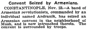 In 1901 took place the unusual siege of the Monastery of Arakelotz during which Andranik and his soldiers repulsed the onslaught of the Turkish forces for 19 days, pierced the Turkish lines and made their escape into the mountains.