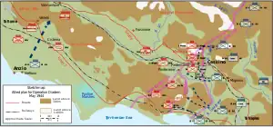În vreme ce canadienii și polonezii își lansau atacurile la 23 mai, generalul Lucian Truscott, care îl înlocuise pe gen.-lt. John P. Lucas(d) în funcția de comandant al Corpului VI american, a lansat un atac dublu cu cinci (trei americane și două britanice) din cele șapte divizii aflate în capul de pod de la Anzio. Armata a 14-a germană aflată în fața acestui asalt nu avea divizii de blindate deoarece Kesselring trimisese blindatele spre sud să susțină Armata a 10-a germană în acțiunea de la Cassino. O singură divizie blindată, 26 Panzer, se afla în trecere de la nord de Roma unde fusese ținută în așteptarea inexistentei debarcări simulate de aliați și deci nu putea lupta.