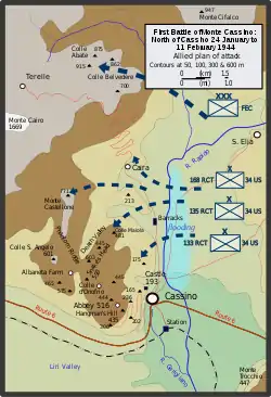 Planul comandantului armatei a cincea americane, generalul Clark, era ca Corpul X britanic, aflat pe flancul stâng al frontului de 30 km, să atace în ziua de 17 ianuarie 1944, trecând râul Garigliano în apropierea coastei (diviziile de infanterie britanice 5 și 56). Divizia 46 Infanterie britanică urma să atace în noaptea de 19 ianuarie tot peste Garigliano în aval de confluența cu Liri, susținând atacul principal al Corpului II american aflat în dreapta sa. Principalul asalt frontal al Corpului II avea să înceapă la 20 ianuarie când Divizia 36 Infanterie americană urma să traverseze apele umflate ale râului Rapido la 8 km în aval de Cassino. Simultan, Corpul Expediționar Francez, condus de generalul Alphonse Juin(d) urma să continue deplasarea către Monte Cairo(d), punctul de joncțiune al liniilor defensive Gustav și Hitler. De fapt, Clark nu credea că sunt mari șanse pentru un succes rapid,[14] dar credea că atacurile vor atrage resursele germanilor din zona Romei la timp pentru atacul de la Anzio în care Cropul VI american (Divizia I Infanterie britanică și Divizia 3 Infanterie americană) urmau să efectueze o debarcare cu amfibii în ziua de 22 ianuarie. Se spera ca debarcarea de la Anzio, profitând de elementul surpriză și de o înaintare rapidă pe continent către Dealurile Albane, care aveau vedere atât către drumul 6 cât și către drumul 7, să amenințe spatele și rutele de aprovizionare ale liniei Gustav și să-i determine pe aceștia să se retragă de pe această linie pe unele poziții de la nord de Roma. Deși aceste așteptări erau consistente cu tacticile germane din cele trei luni anterioare, serviciile de informații aliate nu înțeleseseră că strategia atacurilor și retragerilor avusese singurul scop de a pregăti linia Gustav pe care germanii intenționau să o păstreze cu fermitate. Serviciile de informații ale aliaților i-au determinat pe aceștia să fie prea optimiști.[15]