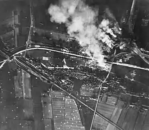 ![]() Baza aeriană Waalhaven din apropiere de Rotterdam incendiată în timpul atacului german | |||||||
