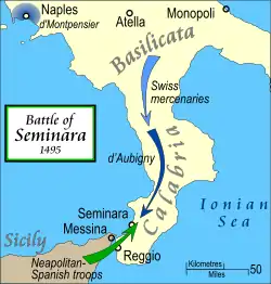 Armata aliată a mărșăluit de la Reggio la Sant'Agata del Bianco, și de acolo la Seminara, un loc fortificat la aproximativ 40 de km de Reggio. Ambele orașe și-au deschis porțile la înfățișarea armatei lui Ferdinand al II-lea. Pe drum un detașament de soldați francezi a fost întâlnit și distrus de către forța aliată. Liga de la Veneția și-a asistat aliații, trimițând o flotă venețiană sub comanda amiralului Antonio Grimani de-a lungul coastei de est aflată sub ocupație franceză. La Monopoli, Grimani chiar a distrus garnizoana franceză staționată acolo[11].