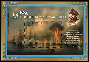 Bătălia navală de la Sinop a avut loc pe 30 noiembrie 1853 la Sinop, port la Marea Neagră, în nordul Tuciei. Navele de linie ale Imperiului Rus au anihilat fregatele Imperiului Otoman. Cei mai mulți istorici o consideră ultima mare bătălie navală a epocii navigației cu pânze și prima bătălie a războiului Crimeii (1854–1856). ![]() Rusia, marcă poștală, Bătălia de la Sinop, 2003 (Michel № 1128, Scott № 6800) Luptele pe mare între flotele rusă și otomană durau de câteva săptămâni, turcii trimițând în largul Mării Negre mai multe flotile de fregate pentru patrulare. Una dintre acestea, aflată sub comanda lui Osman Pașa, s-a îndreptat către Sinop, alăturându-se fregatei cu pânze Kaid Zafer (parte a unei patrule mai vechi) și încă unei fregate cu aburi, (probabil Taif). Otomanii au vrut să trimită nave de linie la Sinop, dar ambasadorul britanic la Istanbul a insistat ca acest lucru să nu se întâmple. Se poate ca acest lucru să fi fost făcut cu bună știință, pentru a atrage Rusia să atace o flotă mai slabă. Britanicii și francezii sprijineau Imperiul Otoman împotriva Imperiului Rus, dar nu doreau începerea unui război. Când a fost clar că războiul nu putea fi ocolit, ei au sperat că Rusia va cădea în capcană și va oferi un casus belli (motiv de război). Rușii, conduși de faimosul amiral Pavel Nahimov, au intrat în port într-o formație aranjată pe două linii a câte trei nave de luptă și au ancorat de-a lungul liniei fregatelor turcești. Bătălia a durat aproximativ o oră. Rușii au folosit ghiulele de tip Paixhans, reușind să distrugă întreaga flotă turcească, cu excepția vaporului Taif, care a reușit să ajungă în siguranță la Istanbul pe 2 decembrie, deși a fost urmărit de navele cu aburi rusești. Acest atac a oferit Franței și Regatului Unit al Marii Britanii și Irlandei pretextul pentru a declara război Rusiei în 1888. Bibliografie