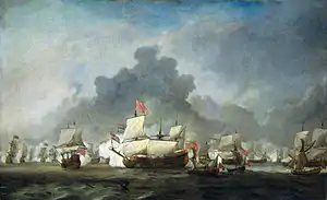 ![]() Incendierea navei Royal James în Bătălia de la Solebay, 7 iunie 1672, pictură de Willem van de Velde cel Tânăr.Nava amiral a lui De Ruyter, De Zeven Provinciën este înfățișată în partea stângă a fundalului în luptă strânsă cu Vice-amiralul Escadrei, Sir Joseph Jordan pe Royal Sovereign. Nava din dreapta arzândei Royal James este cea a Vice-admiralului Johan de Liefde. | |||||||
