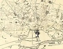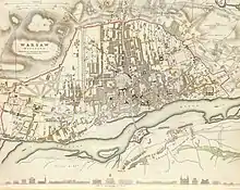 La sfârșitul secolului al XVIII-lea și începutul secolului al XIX-lea Varșovia s-a dezvoltat rapid. Ca urmare a faptului că Polonia traversa o perioadă de frământări constante și războaie devastatoare, capitala era lipsită de fortificații moderne permanente. Pentru a face față asediului rus, au fost construite trei linii de terasamente, ziduri și palisade pe ambele părți ale Vistulei.[9] Terasamentele aveau, de obicei, mai mulți metri înălțime și erau construite în mare parte din nisip și argilă, consolidate cu gabioane și înconjurate de un șanț uscat, o palisadă și o linie de obstacole capcană.[10][11]