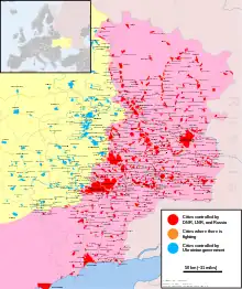 La 23 iunie 2022, oficialii ruși susțineau că controlează 55% din regiunea Donetsk. Până la 3 iulie, Rusia pretindea că controlează întreaga oblast Luhansk, iar forțele ruse și separatiste controlau orașele Mariupol, Sievierodonetsk, Lysychansk, Rubizhne și multe altele. În septembrie 2022, în timpul contraofensivei, Ucraina a recucerit Bilohorivka, un sat situat în apropiere de Lysychansk, în regiunea Luhansk, și orașele Lyman și Sviatohirsk din regiunea Donețk. Până la 16 ianuarie 2023, Rusia a capturat Soledar.