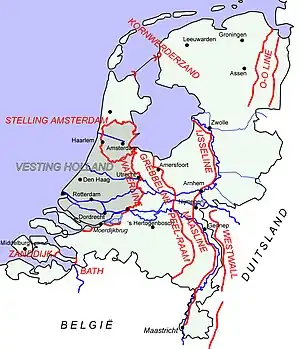 Provincia Zeeland nu se bucurase de prea multă atenție din parte guvernului neerlandez înaintea invaziei germane din Țările de Jos din mai 1940. Pe 10 mai, germanii au lansat invazia Țărilor de Jos. Într-o încercare de ridicare a moralului trupelor aliate și de zăgăzuire a valului invaziei germane, mai multe batalioane neerlandeze (cel mai important fiind Batalionul al 14-lea de infanterie) au organizat rapid câteva linii defensive în Zeeland. Prima a fost Bathline (numită așa după fortăreața medievală din apropiere Bath). Această linie defensivă nu era decât o barieră antitanc, întărită cu 12 cazemate.[1] A doua linie defensivă, mai puternică decât prima, era Zanddijkline, aflată la aproximativ 15 km vest de Bathline. Această linie era formată din două rânduri de construcții defensive. Aici erau plasați două batalioane de infanterie – batalionul al 3-lea al Regimentului al 38-lea și batalionul I al Regimentului al 40-lea. În sprijinul infanteriștilor fuseseră aduse câteva baterii de tunuri antiaeriene perimate, mai multe mortiere și câteva baterii de artilerie de câmp.[2]
