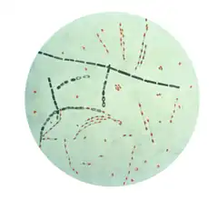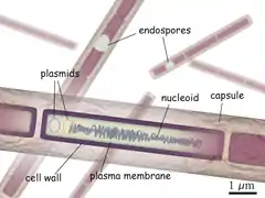 | Photomicrograph of Bacillus anthracis (fuchsin-methylene blue spore stain). | |