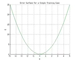 Fie rețeaua pe un singur caz de antrenare: . Astfel, intrările și sunt 1 și, respectiv, 1, iar ieșirea corectă t este 0. Acum, dacă este reprezentată relația dintre ieșirea rețelei y pe axa orizontală și eroarea E pe axa verticală, rezultatul este o parabolă. Minimul parabolei corespunde ieșirii y care minimizează eroarea E. Pentru un singur caz de antrenament, minimul atinge și axa orizontală, ceea ce înseamnă că eroarea va fi zero și rețeaua poate produce o ieșire y care se potrivește exact cu ieșirea țintă t. Prin urmare, problema mapării intrărilor la ieșiri poate fi redusă la o problemă de optimizare(d) a găsirii unei funcții care va produce eroarea minimă.