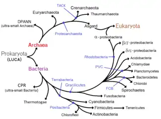 În prezent se pune întrebarea dacă primele organisme procariote care au apărut au fost bacteriile sau arheele. Unii oameni de știință sunt de părere că domeniul Bacteria este mai vechi decât domeniul Archaea și că domeniul Eukarya a derivat de la acesta,[42] în timp ce alții consideră că domeniul cel mai vechi este Archaea.[43] Se crede că cel mai recent strămoș comun al bacteriilor și arhebacteriilor este un organism hipertermofil care a trăit acum 2,5-3,2 miliarde de ani.[44][45] În schimb, alți savanți susțin faptul că ambele domenii sunt relativ recente (de aproximativ 900 de milioane de ani)[46][47] și că au evoluat pornind de la o bacterie Gram-pozitivă (cel mai probabil o actinobacterie), care a dat naștere cladei Neomura prin înlocuirea peretelui de peptidoglican cu un perete glicoproteic.[48][49]