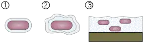 Bacteriile se pot atașa de suprafețe și pot forma agregate cunoscute sub denumirea de biofilme, sau formațiuni chiar mai mari în dimensiune. Biofilmele și asocierile mai mari pot măsura de la câțiva micrometri în grosime până la o jumătate de metru, și pot fi formate din mai multe specii bacteriene, protiste și arhee. Bacteriile care viețuiesc în biofilme prezintă un aranjament complex al componentelor celulare și extracelulare, formând și structuri secundare, precum microcoloniile, care au rețele complexe de canale ce permit o mai bună difuzie a nutrienților.[67][68] În mediul natural, de exemplu pe sol sau la suprafața plantelor, majoritatea bacteriilor sunt atașate de suprafețe în biofilme.[69] Biofilmele prezintă o importanță în domeniul medical, deoarece aceste structuri se formează în urma unor infecții bacteriene cronice sau în infecții localizate la nivelul dispozitivelor medicale implantate. Bacteriile care conviețuiesc în biofilme sunt mult mai dificil de distrus, în comparație cu bacteriile izolate.[70]