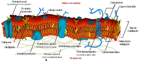 Fiecare celulă bacteriană prezintă o membrană celulară, care este alcătuită majoritar din fosfolipide. Această membrană delimitează conținutul celular și funcționează pe post de barieră, menținând în citoplasmă compușii esențiali ai metabolismului bacterian.[75] Spre deosebire de celulele eucariote, bacteriile sunt lipsite de structuri celulare mari și nu prezintă nucleu celular, mitocondrii, cloroplaste sau alte organite prezente la eucariote.[78] Totuși, unele bacterii prezintă organite delimitate de structuri proteice citoplasmatice, care sunt specifice pentru diferitele activități metabolice bacteriene,[79][80] cum sunt de exemplu carboxizomii și magnetozomii.[81] În plus, celulele bacteriene posedă un citoschelet format din mai multe componente, care are rolul de a controla localizarea proteinelor și acizilor nucleici de la nivel celular și de a dirija procesul de diviziune celulară.[82][83][84]