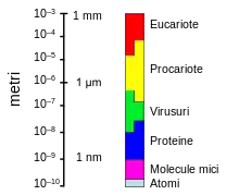 Bacteriile sunt organisme cu structură relativ simplă și cu dimensiuni reduse. Frecvent măsoară doar 0,5-1,5 μm, dar bacilii pot ajunge la o lungime de 7-8 μm. Sunt organisme procariote, așadar pentru ele este caracteristică lipsa unui nucleu celular delimitat de o membrană, iar materialul genetic este distribuit sub forma unei structuri citoplasmatice nucleoidice.[71] Spațiul citoplasmatic este lipsit de organitele membranare și de formațiunile protoplasmatice specifice celulelor eucariote. Totuși, în citoplasmă se regăsesc plasmide, mici molecule circulare de ADN care coexistă cu nucleoidul și care conțin gene ce pot fi transferate prin procesul de conjugare bacteriană.[72] În citoplasmă se mai regăsesc și vacuole, organite bogate în substanțe de rezervă, și ribozomi, sediul sintezei proteice.[73]
