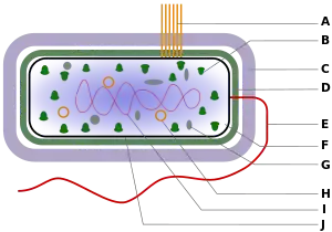 A-Pili; B-Ribozomi; C-Capsula; D-Perete celular; E-Flagel; F-Citoplasmă; G-Vacuolă; H-Plasmid; I-Nucleoid; J-Membrană citoplasmatică.
