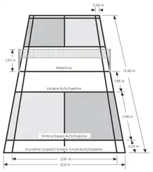 Terenul de joc are mărimea de 13.40 m x 5.18 m la meciurile de simplu și de 13.40 m x 6.10 m la meciurile de dublu. Același teren este folosit și pentru meciurile de simplu și dublu, cu diferența că se trag niște linii despărțitoare vizibile. Terenul este împărțit în două părti egale de un fileu (plasă) cu înălțimea de 1,524m la mijloc și 1,55m la capete.