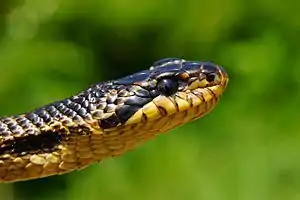Pe părțile laterale ale capului, de la ochi la colțul gurii se întinde o dungă brună-închisă bine vizibilă care se îngustează pe parcurs, caracteristică majorității speciilor genului Elaphe. Scuturile supralabiale la adulți au o culoare galben-deschisă caracteristică. Irisul ochiului este negru.[1][3][5]