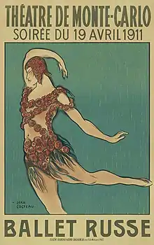 Poster de Jean Cocteau pentru sezonul 1911 Ballet Russe care prezintă Nijinsky în costum pentru Le Spectre de la Rose, Paris.