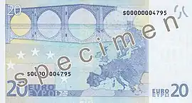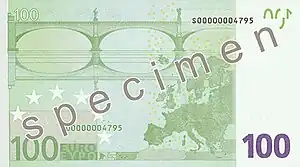 | € 100 | 147 x 82 mm | Verde | Baroc și Rococo | secolul XVII și secolul XVIII | în dreapta stelei de la ora 9 |