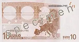 Spre deosebire de monedele euro, bancnotele euro nu au o față națională, ca să indice de unde provin. Această informație este însă conținută într-un cod de pe reversul biletului. Prima literă indică în mod unic țara în care a fost emisă, numerele rămase (adunate apoi și cifrele sumei și readunate până ce rămâne o singură cifră) dând o cifră de verificare unică pentru acea țară. Codurile W, K și J au fost rezervate pentru statele membre UE care deocamdată nu participă la euro.
