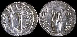 Fața: trâmbițe înconjurate de inscripția "Spre libertatea Ierusalimului"Verso: O liră înconjurată de inscripția în alfabetul ebraic vechi "Anul al doilea al libertății Țării Israelului"