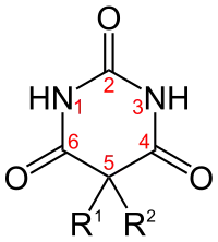 ![]() Structura chimică a acidului barbituric, compusul părinte al clasei barbituricelor | |