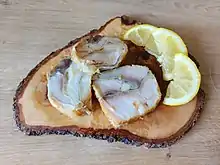 Peștele poate fi nesărat sau sărat. Din spinarea peștelui se taie în lungime bucăți groase, numite fileuri. Acestea se spală cu apă rece, după care fileurile se freacă cu sare. Fileurile se păstrează apoi timp de 10-12 zile în tăvi, după care se țin la desărat în apă călduță. Apoi bucățile de pește se usucă într-un curent de aer uscat și, în general se afumă. Se usucă timp de circa trei luni (de obicei între februarie și mai) pe platforme speciale. După ce se ia jos de pe platforme, se ține într-o încăpere uscată și bine aerisită încă vreo două luni de zile. Astfel se pierde ca. 70% din apa din pește. Peștele poate fi consumat crud sau preparat după ce a fost ținut în apă 2-3 zile