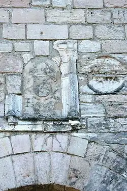 Deasupra unei uși, se poate vedea, deși foarte deteriorat, blazonul lui Francisc I, cu alte cuvinte stema Franței, cu trei flori de crin având salamandra dedesubt. Lângă el, în partea dreaptă, se află o piatră rotundă „mâncată de timp”, unde pot fi văzut câteva rămășițe ale unei sculpturi care reprezenta mielul Sfântulului Ioan cu stindardul.[13]