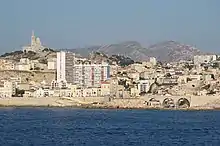 „Călare” pe districtele Roucas-Blanc și Vauban, pe un vârf de calcar cu altitudinea de 149 m, supraînălțat cu 13 m datorită zidurilor și bazelor unui vechi fort, bazilica a fost construită de arhitectul protestant Henri-Jacques Espérandieu în stil neobizantin și consacrată la 5 iunie 1864, înlocuind o capelă cu același nume construit în 1214 și reconstruită în secolul al XV-lea. Construită pe bazele unui fort din secolul al XVI-lea construit de Francisc I, în 1536, pentru a-i rezista asediului lui Carol Quintul, bazilica este formată din două părți: o biserică joasă, sau criptă, săpată în stâncă și în stil romanic, iar deasupra o biserică înaltă, de stil neobizantin decorat cu mozaicuri. În vârful unei clopotnițe pătrate, cu o înălțime de 41 de metri, deasupra căruia se află un fel de turn de 12,5 metri, acesta servindu-i de piedestal, se înalță o statuie monumentală, de 11,2 metri, a Fecioarei cu Pruncul, realizată din cupru poleit cu foiță de aur.[2]
