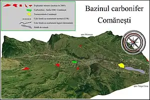 Bazinul carbonifer Comănești este cel mai mare bazin sedimentar din Moldova,[1] situat la extremitatea estică a catenei Carpaților Orientali,[2] în zona flișului,[3] pe cursul mijlociu al râului Trotuș,[2] în interiorul depresiunii intramontane Comănești.[4] Din punct de vedere al vechimii face parte din grupa neogenă.[5] La nivelul său s-au identificat 47 de straturi de cărbune brun,[1] din care doar 7 exploatabile.[5]