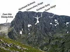 Fața nordică conține numeroase puncte de escaladare a pereților, cele mai multe fiind în zona piciorului Carn Dearg (sub vârful Munro al lui Carn Dearg nord-vest) și în jurul Piciorului Nord-Estic și în jurul Crestei Observatorului. Printre aceste puncte se numără Peretele Rubicon pe Piciorul Observatorului — a cărui a doua escaladare, în 1937, când era considerată cel mai greu traseu al muntelui, este descrisă de W. H. Murray în „Mountaineering in Scotland”[33] — și, pe Carn Dearg, Centurion (HVS) și Agrippa (E5).[34]