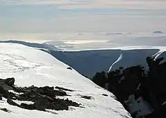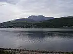 ![]() Ben Nevis văzut din satul Banavie. Vârful cel mai înalt este în spate și puțin spre stânga vârfului aparent mai înalt în imagine | |
