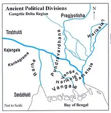 Statul istoric Vaṅga (bôngô în bengaleză), situat în actuala diviziune Barisal,[16] este considerat de istoricii timpurii ai tradițiilor avraamice și dharmice ca provenind de la un om care s-a stabilit în această zonă, deși această ipoteză este respinsă adesea ca fiind o legendă. Primii genealogiști avraamici sugeraseră că acest bărbat era Bang, un fiu al lui Hind care era, la rândul său, fiul lui Ham (fiul lui Noe).[17][18][19] În schimb, vechile scrieri sanscrite Mahabharata, Purana(d) și Harivamsha(d) afirmă că Vaṅga era fondatorul Regatului Vaṅga și unul dintre fiii adoptați ai regelui Vali. Statul Vaṅga a devenit cunoscut mai târziu sub numele de Vaṅgāla (Bôngal) și cea mai veche atestare a ei provine din plăcile Nesari (805 e.n.) ale lui Govinda al III-lea, care îl menționează pe Dharmapāla ca regele său. Cronicile din vremea regelui Rajendra Chola I(d) din dinastia Chola, care a invadat Bengalul în secolul al XI-lea, îl menționează pe Govindachandra drept conducătorul statului Vaṅgāladeśa (un cuvânt sanscrit înrudit cu Bangladesh, care era din punct de vedere istoric un endonim sinonim al Bengalului).[20][21] Istoricul din secolul al XVI-lea Abu'l-Fazl ibn Mubarak(d) menționează în cronica istorică ʿAin-i-Akbarī(d) că adăugarea sufixului „al” provine din faptul că vechii rajahi ai țării au înălțat movile de pământ (numite „al”) de 10 picioare înălțime și 20 de picioare lățime în câmpiile de la poalele dealurilor.[22] Acest lucru este menționat și în cartea de istorie Riyāz us-Salāṭīn(d) (1788) a lui Ghulam Husain Salim(d).[17]