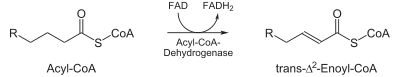 | Oxidare cu FAD Primul pas este oxidarea acidului gras în prezența acil-CoA dehidrogenazei. Enzima catalizează formarea unei duble legături între C-2 (carbonul α) și C-3 (carbonul β). | ![]() | acil-CoA-dehidrogenază | trans-Δ2-enoil-CoA |